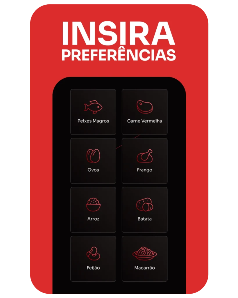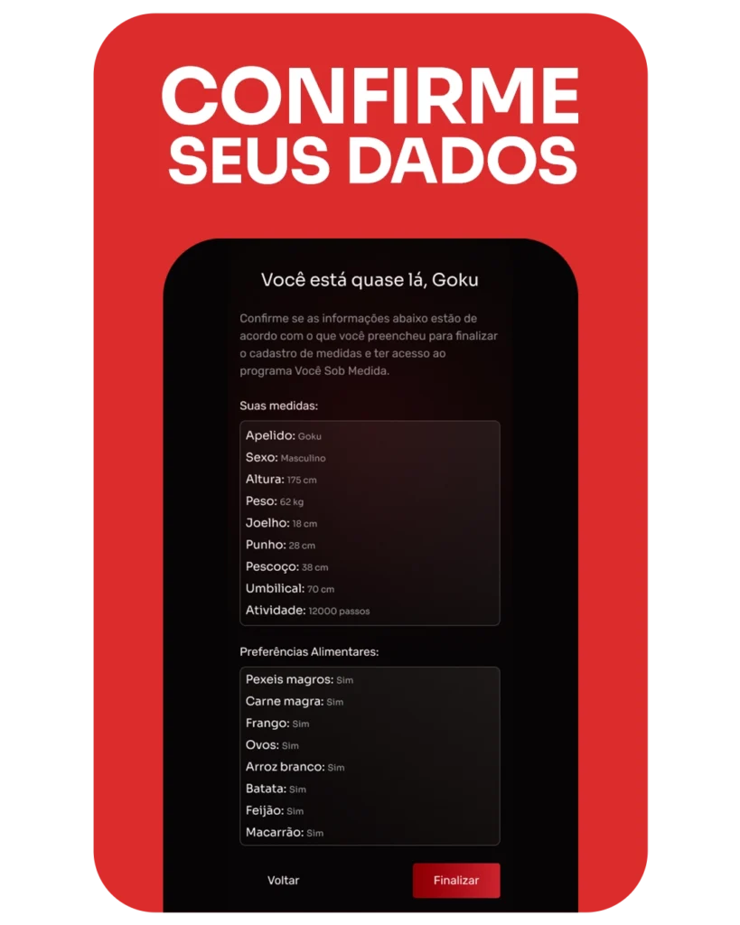 Personalizado com base no seu corpo, suas medidas e no que você realmente gosta de comer. Simples. Prático. Direto ao ponto.
